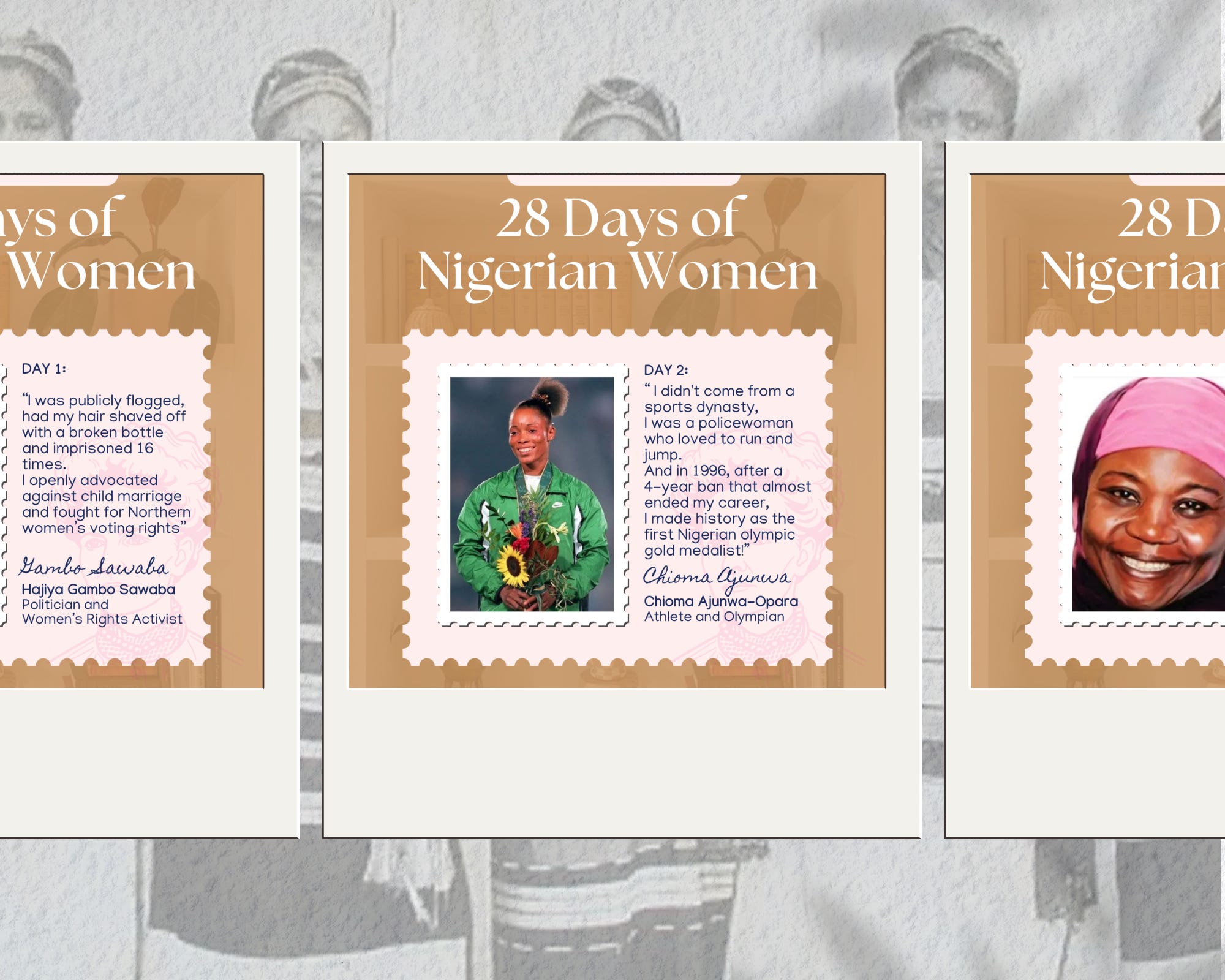 So a few days into March this year, I decided to create a social content project themed, “28 Days of Nigerian Women”. It was a series of posts about pioneering Nigerian women across sectors and history. Each post had an on-screen text written as a quote (fictionalised) from the woman being highlighted, detailing her accomplishments in conversational language. I had not felt so alive, so invigorated and so angry all at once: we as women had contributed so much to all sectors of Nigerian life and yet sidelined into domestic, politically neutral or completely inaccurate narratives in a country where the current generation of Nigerian women seemingly needed a limitless supply of courage and self-trust just to survive.