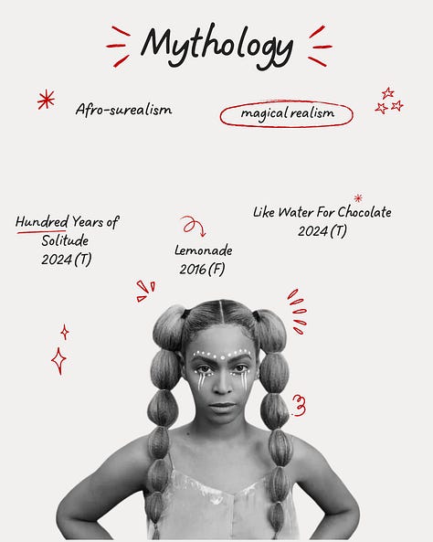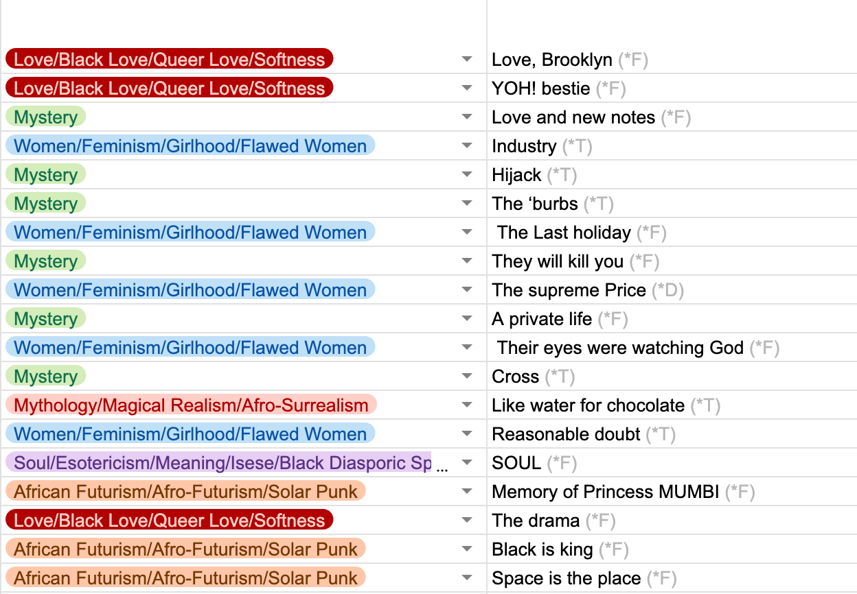 So I aggregated. While aggregating titles, I also began to eliminate. I began to refine my selection through themes asking myself: “who am I becoming and what stories support that becoming?” What survived became structured in a Google Sheets document sorted by themes, film/series titles, recommended media pairing, film or book suggestions from HER PERSONAL CURRICULUM community members and a vote button (“Recommend 👍🏾”, “ehhh....depends 🤷🏾♀️”, “Nah 😒”).