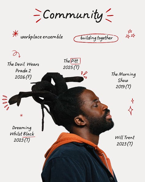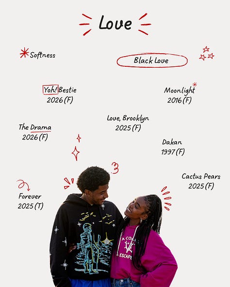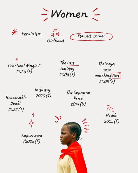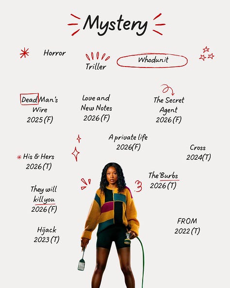It is a curated, thematic selection of films and television I intend to consume across the year. It is deliberate. It is modular. It evolves as new projects are announced. What initially started as a question on my tiktok about how to consume media with intention, morphed into a notebook list of films and television projects I felt inspired by or curious about, arranged into themes that are important to me, structured in a spreadsheet and translated into a visual board.